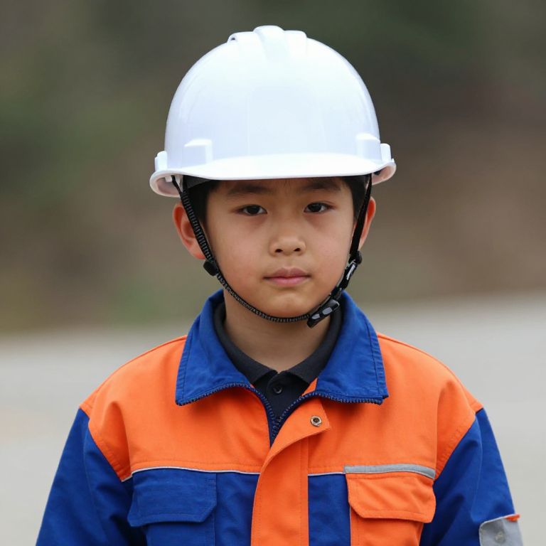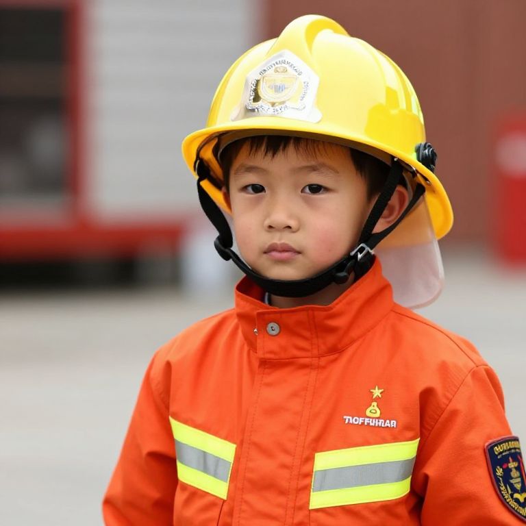 A young boy is wearing a fireman's uniform with a yellow helmet and orange jacket.