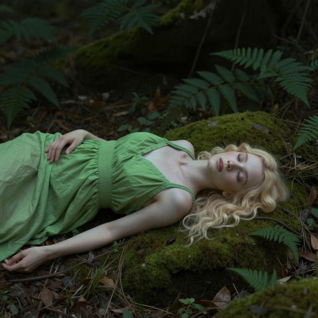 A photograph of a beautiful woman with pale skin and wavy blonde hair, lying on a mossy forest floor. She's wearing a flowing, bright green dress that drapes over her body. Her eyes are closed, and she has a serene expression. The background is dark and filled with dense, leafy greenery, creating a mystical, ethereal atmosphere. The light highlights her face and dress, adding contrast.