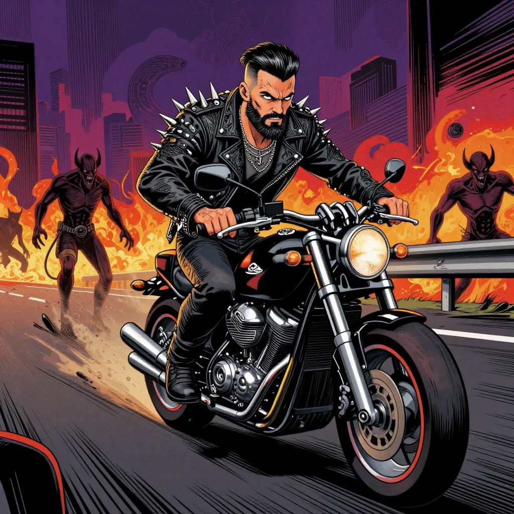 Comic-style digital art: muscular bearded man with spiked leather jacket riding black motorcycle, pursued by demonic figures amidst fiery urban chaos.