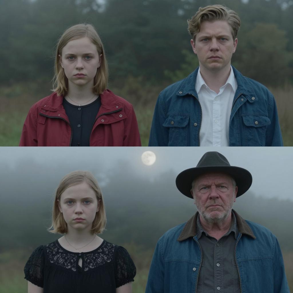 Photograph of four people standing in a foggy, forested background. Top left: young woman with light brown hair in a red jacket, serious expression. Top right: young man with light brown hair, blue jacket, white shirt, serious expression. Bottom left: young girl with short blonde hair, black dress, serious expression. Bottom right: older man with grey hair, black hat, blue jacket, serious expression. Moon visible in background.