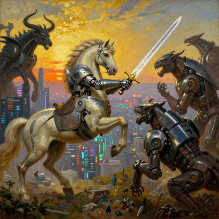 Digital fantasy artwork: Robotic, armored horse with glowing sword clashes with three mechanical, horned monsters against a sunset-lit futuristic cityscape.