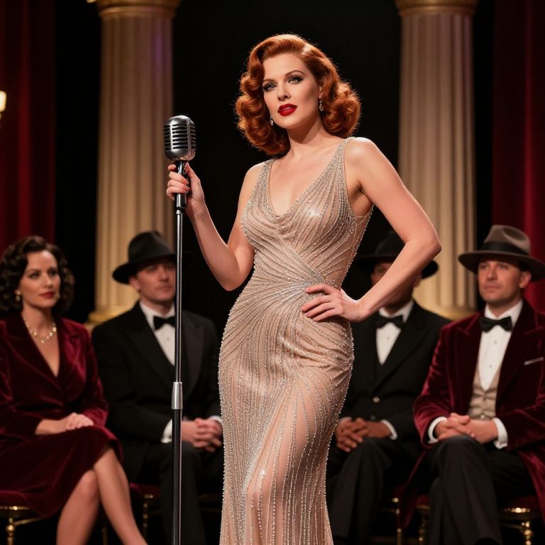 A sultry 1930s jazz singer with full, voluminous chestnut hair, sharp cheekbones, and a knowing gaze performs in a long, sheer beaded gown that drapes smoothly, her posture confident and flirtatious, on a dimly lit stage with a vintage microphone and a backdrop of fluted pillars, the audience in velvet coats and fedoras watching intently, realistic studio lighting and rich textures, cinematic detail