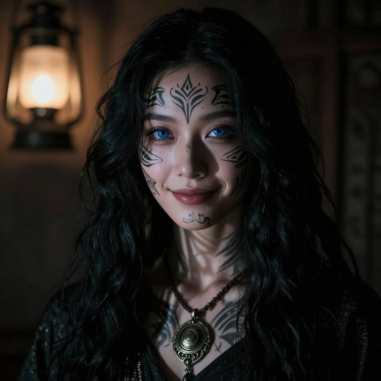 Craft an ultra-realistic portrait of a mysterious figure with timid blue eyes and an enigmatic smile, framed by cascading jet-black hair. Their unique appearance boasts intricate tribal facial tattoos and a delicate metallic pendant on their chest. Position them in a dimly lit room where the soft glow from an ancient lantern casts ethereal shadows across their face, illuminating nuanced details with an otherworldly ambiance. Capture this enigma from a low angle, peering upwards, to showcase the interplay of light and shadow that evokes emotions ranging from intrigue to reverence, blurring reality into fantasy.