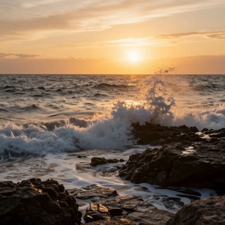 A dramatic digital rendering captures the powerful waves crashing against rocky shores under the golden-hour glow of the setting sun, evoking a nostalgic and cinematic atmosphere where each crest seems to hold whispers of forgotten memories.