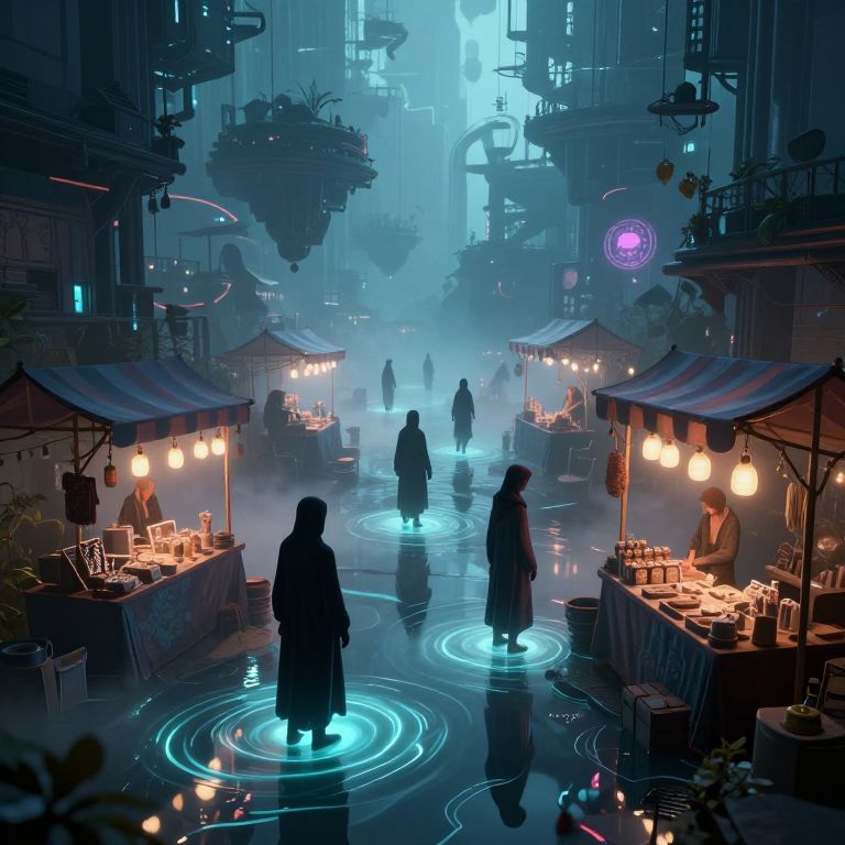 A cyberpunk-inspired 3D render depicts a surreal floating marketplace shrouded in mist, where cloaked figures navigate through pools of liquid light, their silhouettes cast as sentient shadows amidst glowing stalls that trade enigmatic goods and echoes of forgotten truths.