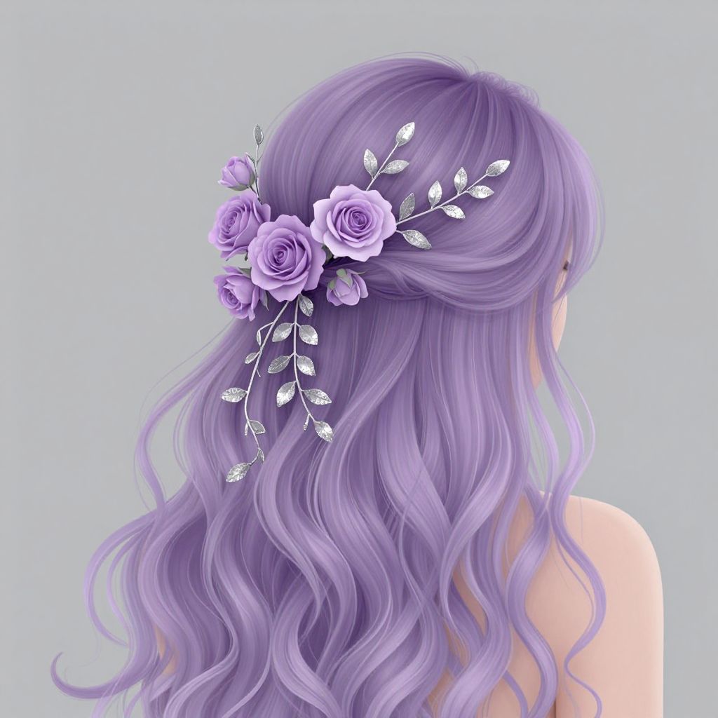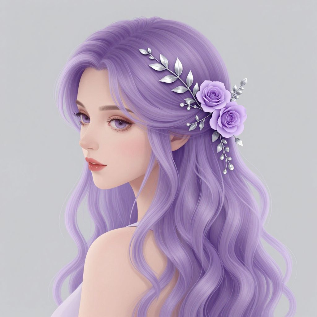 A high-definition digital illustration featuring a woman with cascading lavender hair adorned with a delicate silver leaf bridal hair vine interspersed with lilac roses, rendered in a soft, ethereal style against a neutral gray background.