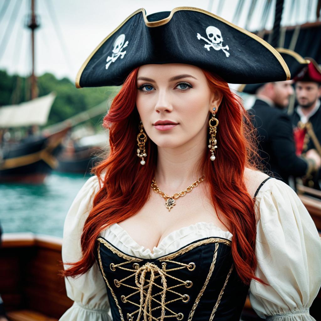 Fancy dress pirate ladies,1girl, hat, red hair, solo, pirate hat, jewelry, watercraft, long hair, earrings, dress, corset, pirate, ship, blurry, blurry background, looking at viewer