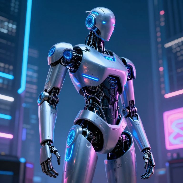 Futuristic humanoid robot standing in a neon-lit cyberpunk cityscape, sleek metallic body with glowing blue accents, intricate mechanical joints, hyper-realistic style