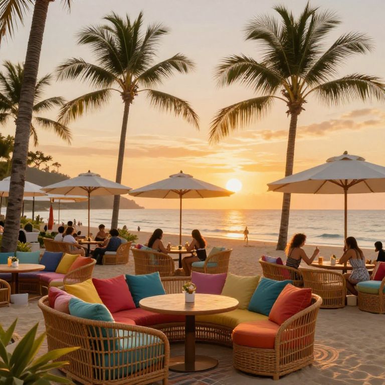 Lounch by the beach, stylish outdoor lounge with rattan furniture, colorful cushions, sun umbrellas, palm trees swaying, sunset sky with golden hues, people relaxing with drinks, tropical vibes, ultra-detailed digital painting.