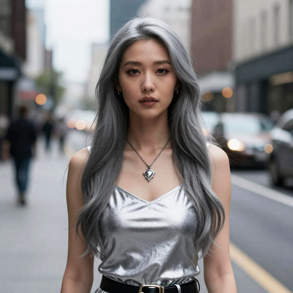 Silver Witch, woman with long gray hair and a necklace on a city street