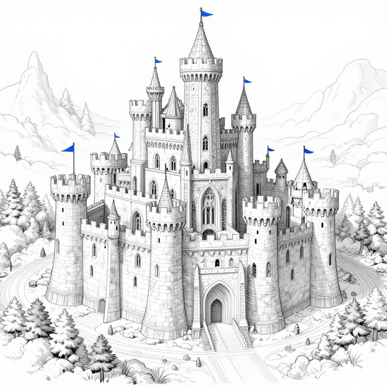 One-Line Drawing medieval city, white marble castle with blue flags in the city center, forest surroundings, fantasy illustration, D&D style,