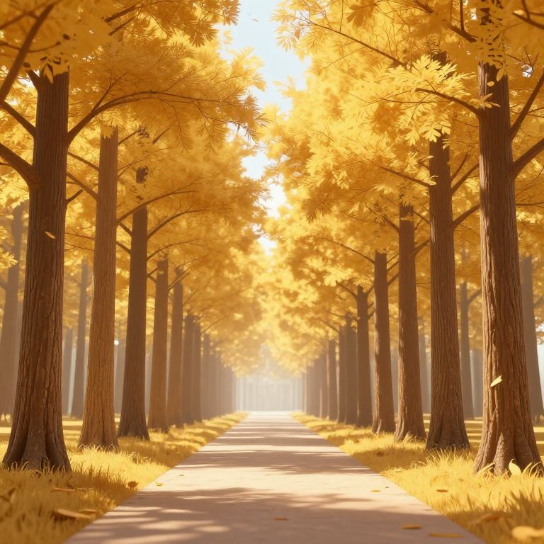 A hauntingly atmospheric 3D-rendered scene depicts a solitary streetlamp casting a warm, golden glow amidst a misty forest, where bare trees and scattered autumn leaves evoke a vintage, eerie ambiance reminiscent of a forgotten, enchanted world.