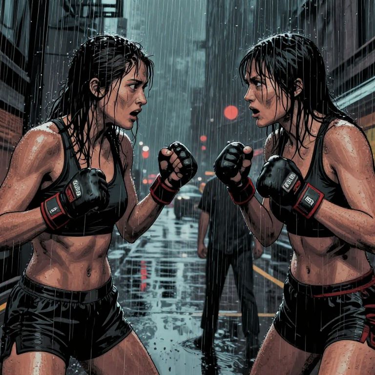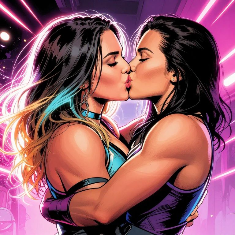 Becky Lynch kiss captured in a vibrant comic book style, dynamic poses with glowing neon lights, intense emotion, detailed facial expressions, dramatic background