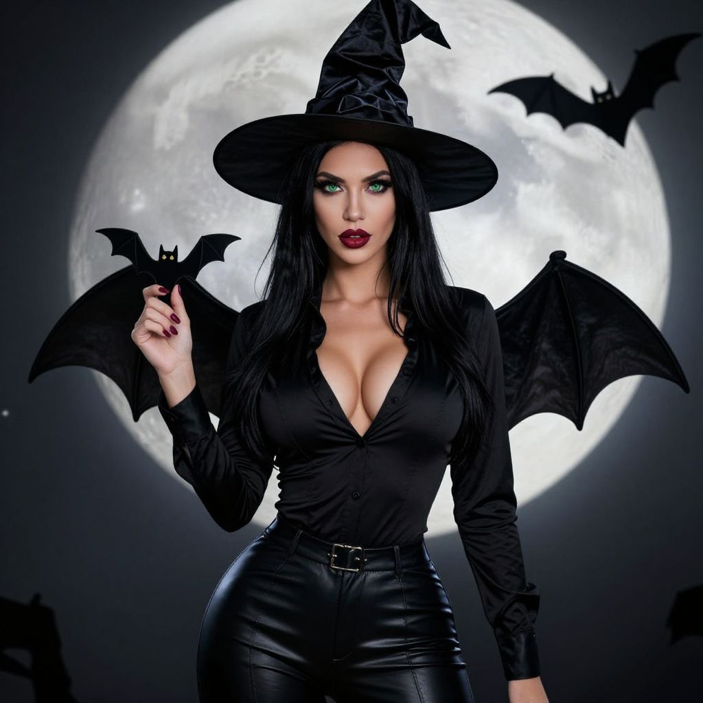 Photograph of a sexy woman dressed as a witch. She has long black hair, striking green eyes, and red lipstick. She's wearing a black witch hat with a curved brim, a low-cut black blouse revealing ample cleavage, and tight black leather pants. She holds a small bat in her right hand, and bat wings are attached to her back. The background features a full moon with a bat silhouette. The image has a dark, gothic vibe.