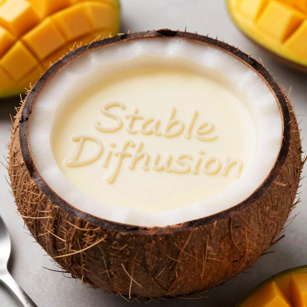 Gourmet cooking photo of a coconut mango panna cotta with the words 'Stable Diffusion' written in icing, studio lighting, high detail, appetizing presentation, professional food photography