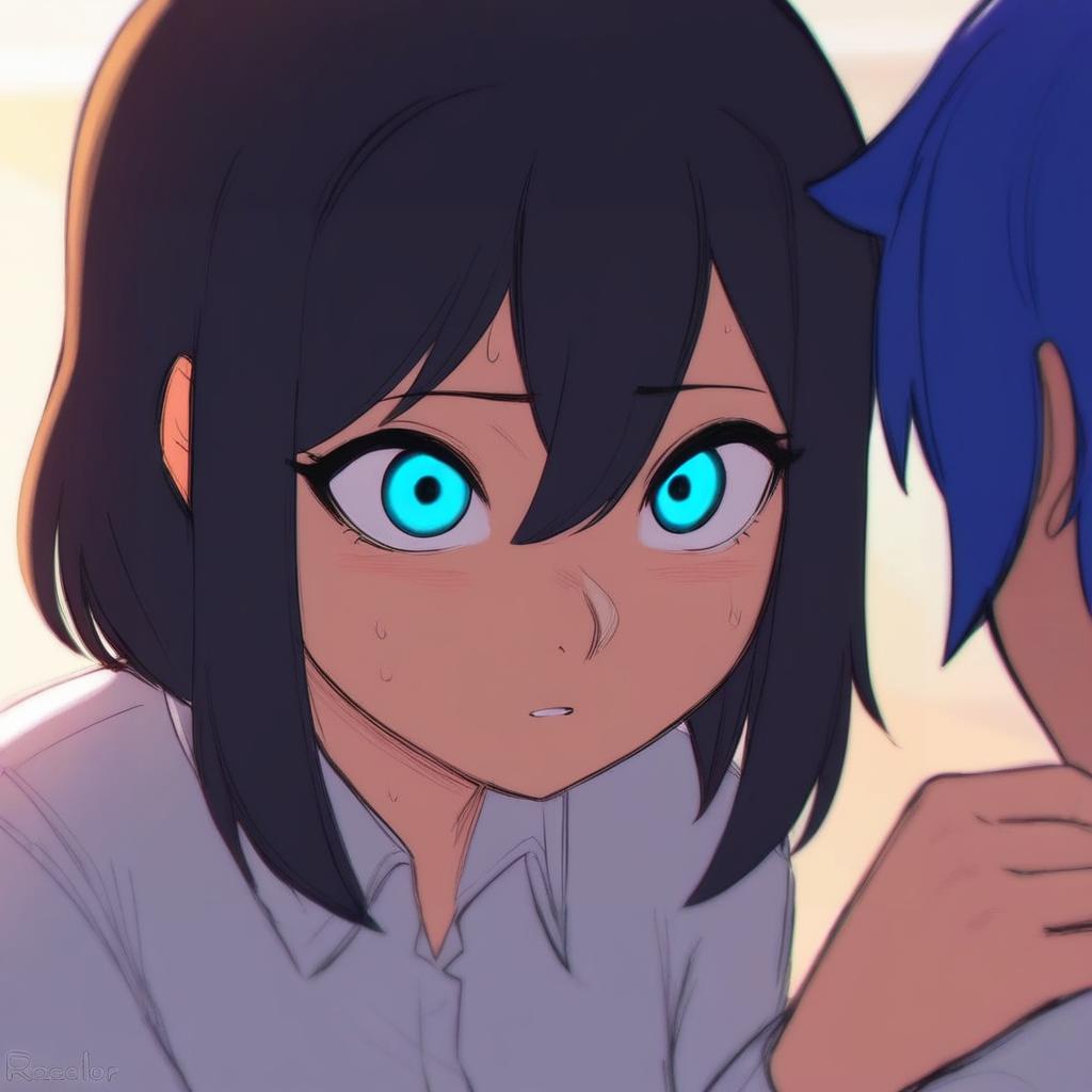 Adachi sakura, adachi to shimamura, 1girl, hair between eyes, blue eyes, black hair, blue hair, short hair, sweat, school uniform, white shirt, collared shirt, long sleeves, by artist razalor, leet
