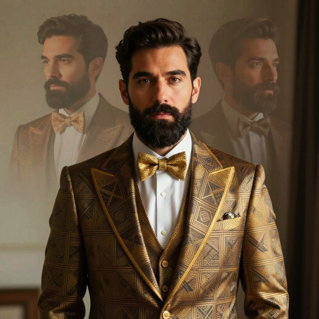 Photograph of a bearded, dark-haired man with a serious expression, wearing a gold plaid suit with a white shirt and matching gold bow tie. The suit has a geometric pattern and includes a pocket square. The background features a blurred, mirrored image of the same man, enhancing the depth and sophistication of the scene. The lighting is warm, highlighting the texture of the suit and the man's facial features. The style is formal and elegant, with a vintage, luxurious feel.