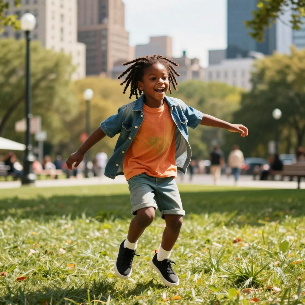 Energetic kid with dreads dancing in mid-air on a colorful street festival stage, vibrant costumes and diverse crowd in the background, festive mood with confetti and bright lights, dynamic composition with focus on movement and joy.
