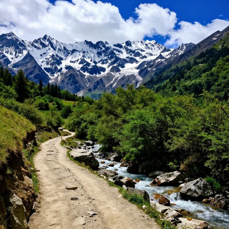 Photograph of a vibrant mountain landscape. A winding, dirt trail runs through a lush, green valley with dense bushes and small rocks. To the right, a clear, fast-flowing stream with white rapids cuts through the terrain. In the background, towering, snow-capped mountains rise under a bright blue sky with scattered, fluffy white clouds. The scene is rich in contrasting colors, with the greenery of the valley, the white snow, and the blue sky creating a vivid, picturesque natural setting.