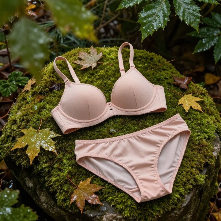 Lingerie arrangement in a rainy autumn garden, dewy leaves, soft green tones, a single blush pink bra and panties on a moss-covered stone, natural sunlight filtering through leaves, serene mood.