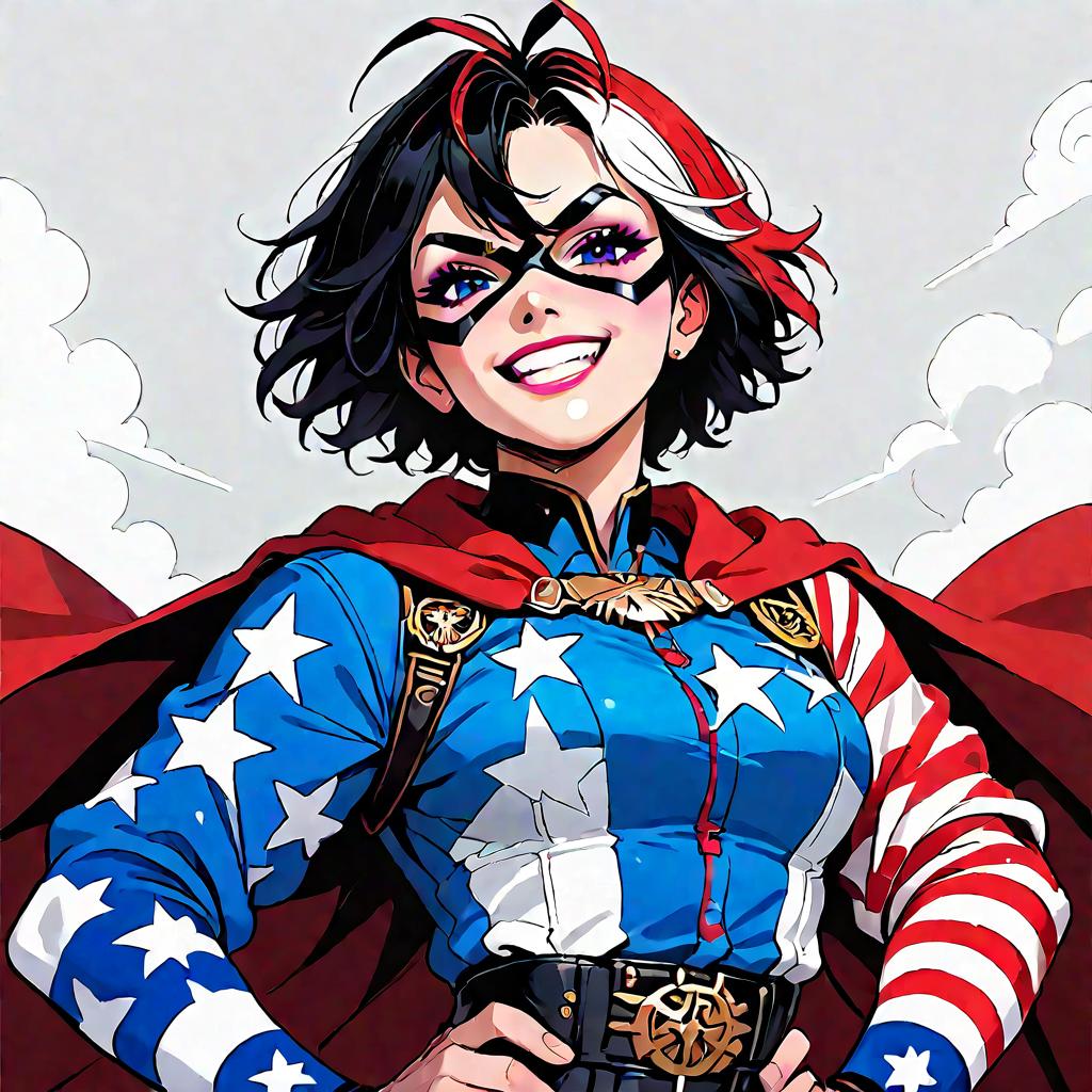 Score_9, score_8_up, score_7_up, source_anime, solo, 1girl, starandstripe, grin, looking at viewer, hands on hips, muscular, antenna hair, domino mask, american flag print, striped bodysuit, red cape