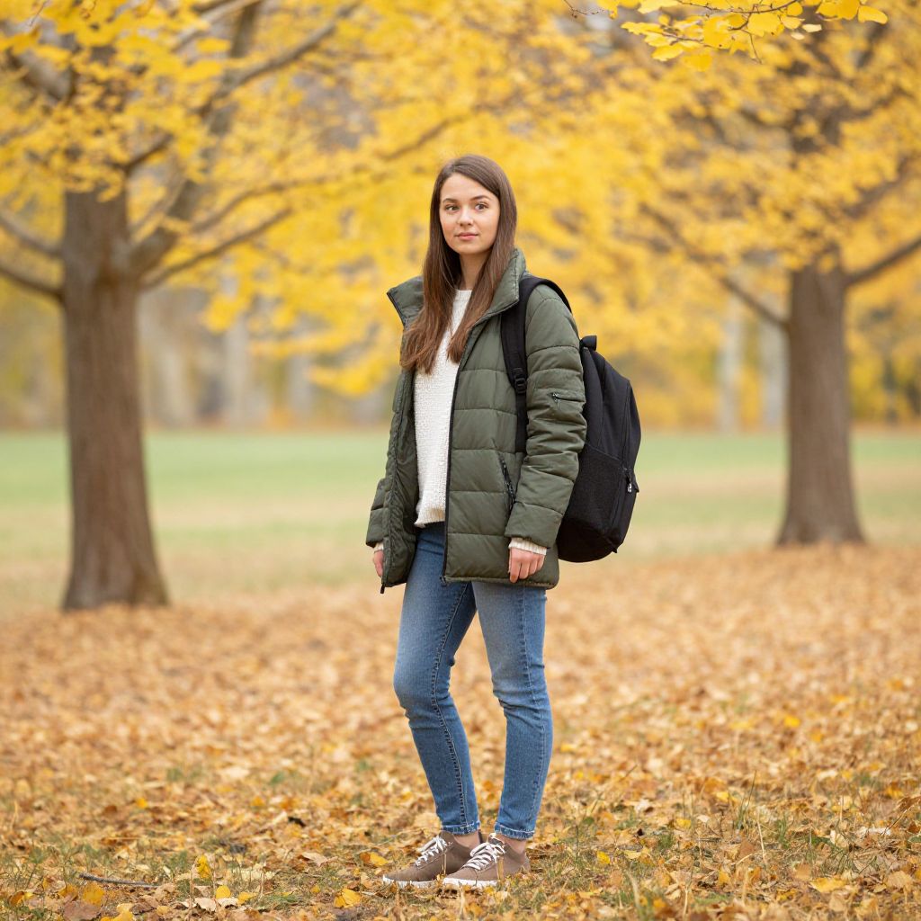 Photograph of a young woman with long brown hair, wearing a green jacket, white shirt, blue jeans, and brown shoes, standing in an autumn
