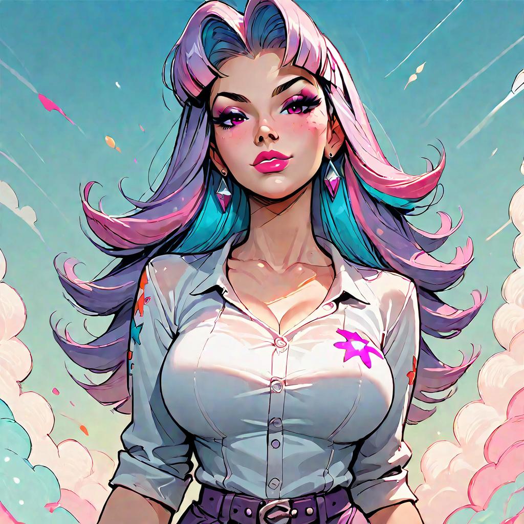 Digital illustration of an anime-style woman with long pastel pink and blue hair, adorned with geometric earrings. She wears a fitted white shirt with colorful star patterns and a high-waisted skirt with a belt, featuring an hourglass figure. The background has a clear blue sky with stylized clouds, highlighting a confident and vibrant character design.