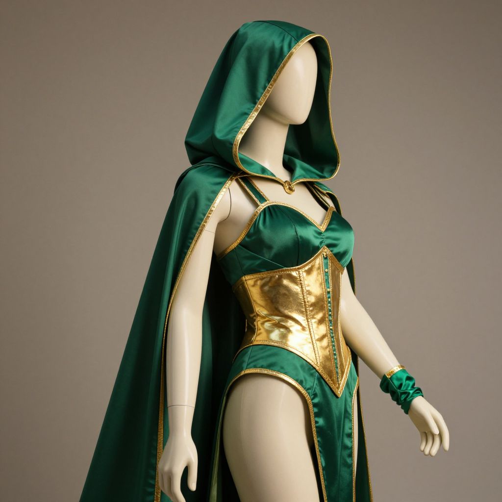 A detailed mannequin wearing a vibrant green and gold costume, featuring a flowing green hood that drapes over its head, a gold-trimmed bodice, and green fabric accents throughout. On its left hand, a green glove is securely attached, adding a touch of elegance and contrast. The mannequin stands in a stylized, slightly tilted pose, as if caught in a moment of motion, with soft ambient lighting highlighting the textures of the fabric and the metallic sheen of the gold details. The background is minimalist and neutral, emphasizing the costume's bold colors and design.