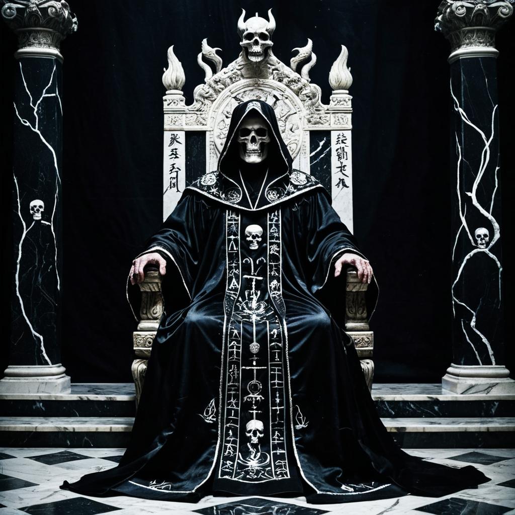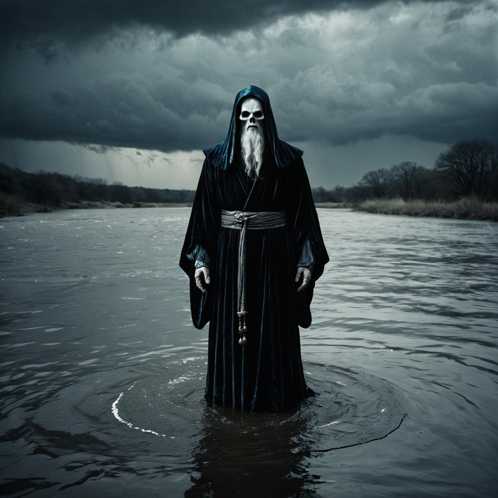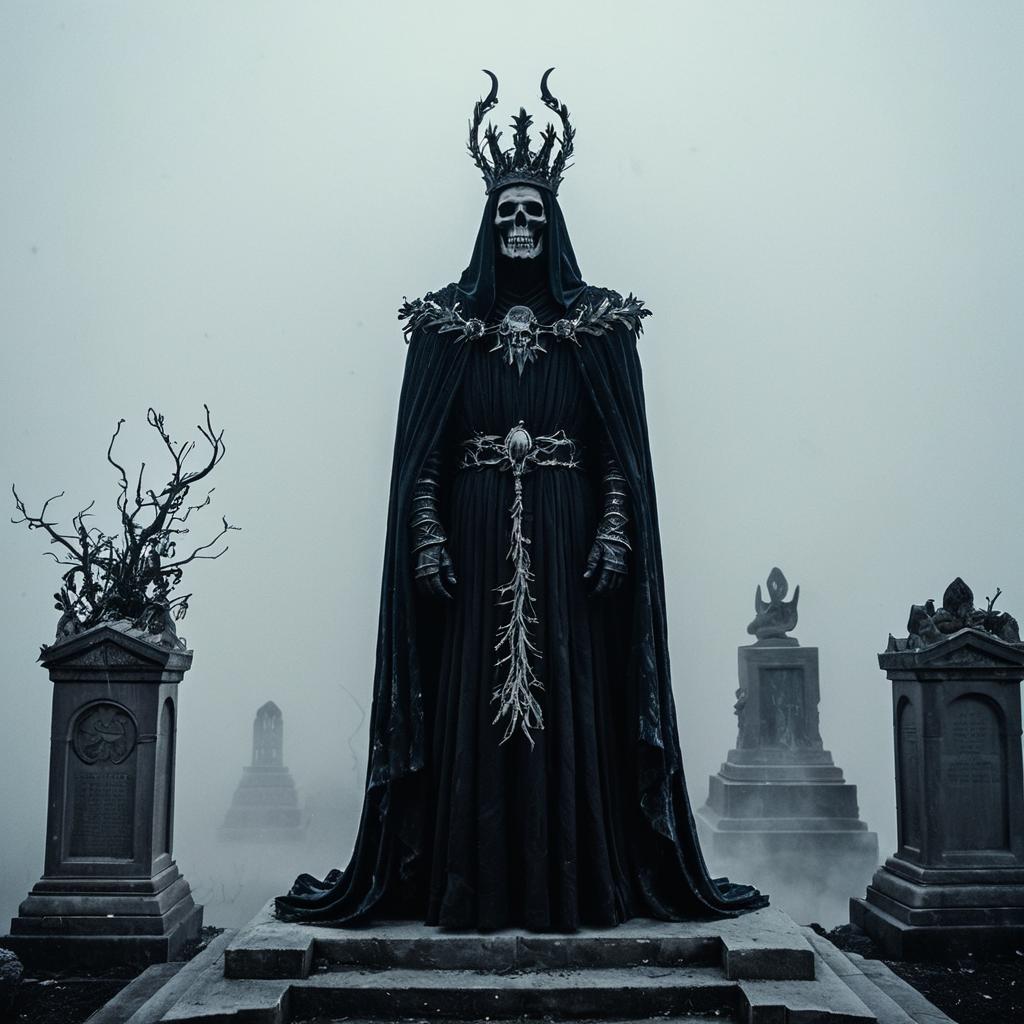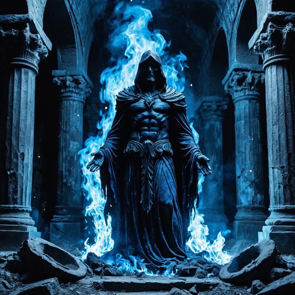 Hades – God of the underworld, shown as a towering phantom hosting tumultuous shadow wraiths sculpted into his form, standing in labyrinthine tunnels wrapped in fog and faint macabre luminescent glyphs.