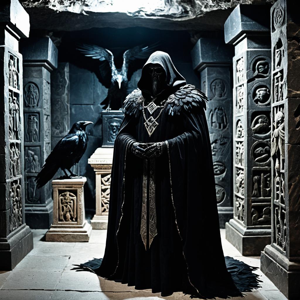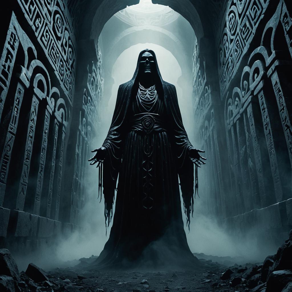 A dark, towering phantom figure representing Hades, god of the underworld, stands in a fog-filled labyrinthine tunnel. His form is sculpted with tumultuous shadow wraiths and faint luminescent macabre glyphs decorate the ancient stone walls, creating an eerie, mystical atmosphere.