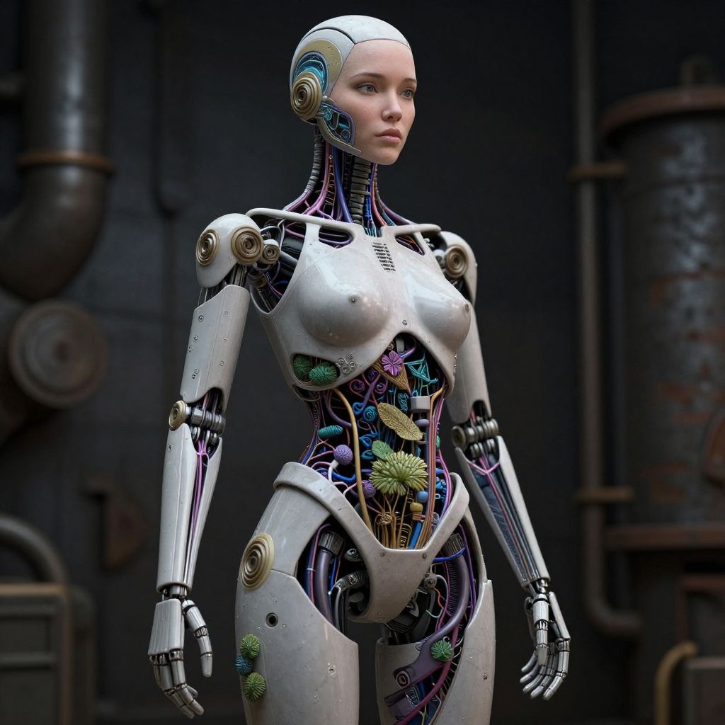A highly detailed, biomechanical woman robot with intricate vascular and botanical elements, set against a dark, industrial background.
