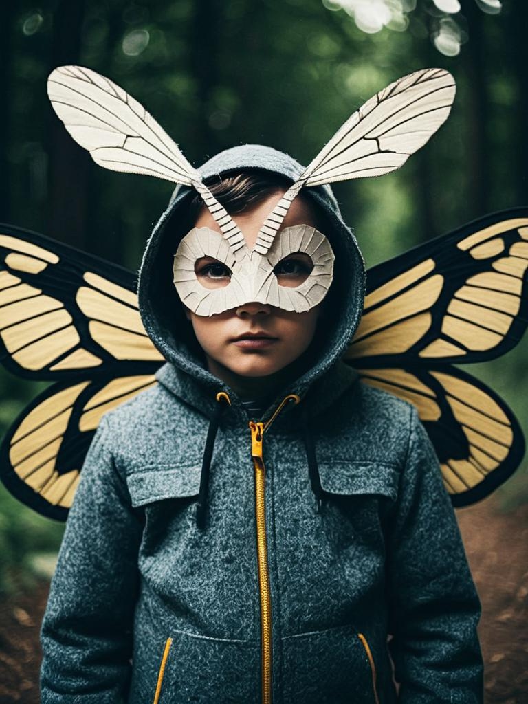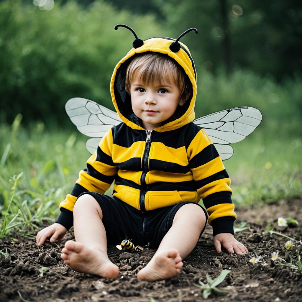 Toddler bee costume ,solo, barefoot, wings, sitting, male focus, blurry, realistic, 1boy, outdoors, bee, blurry background, nature, looking at viewer, full body, bug, child, dirty feet, striped clothes, antennae