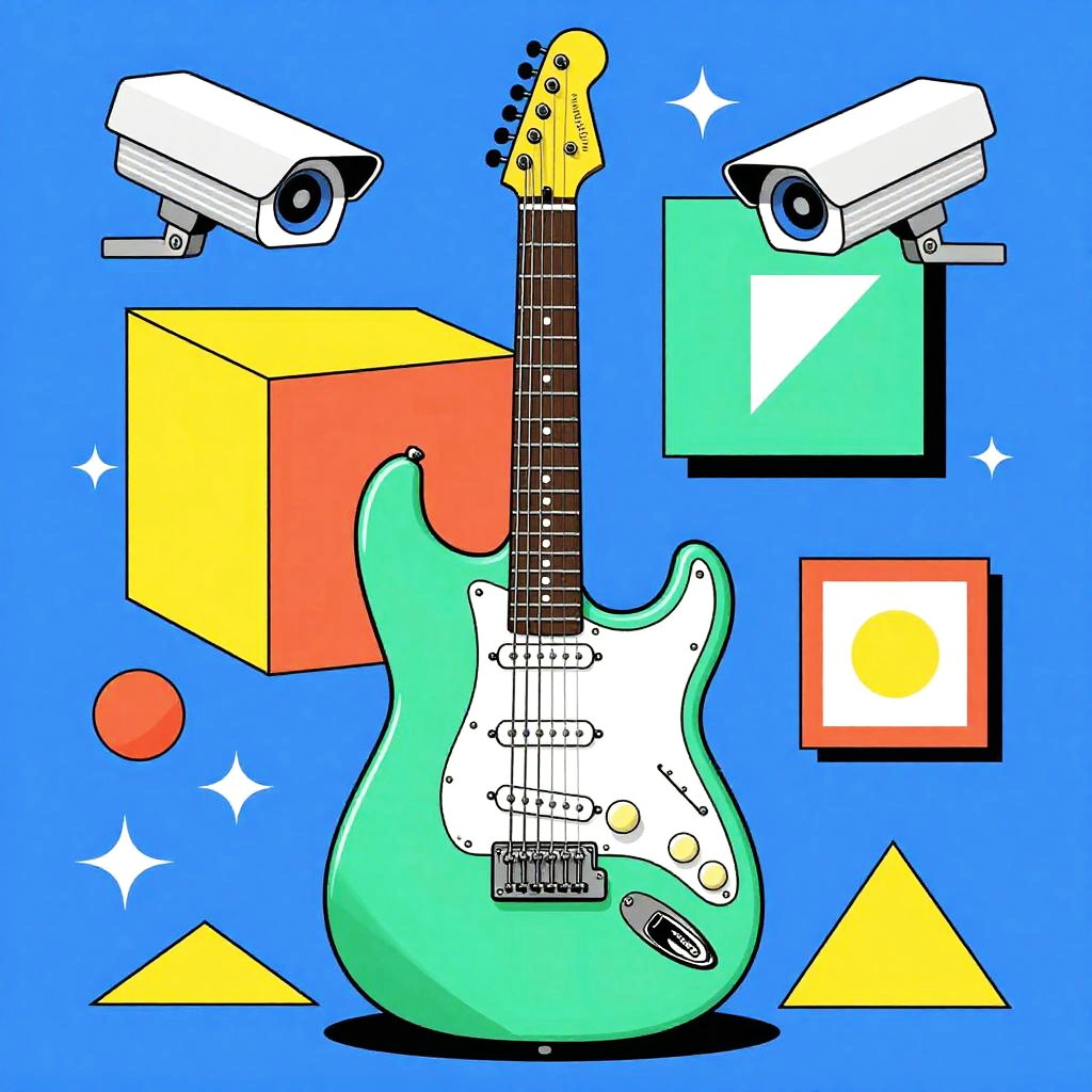 Pop-art style vector illustration of a chartreuse electric guitar with a checkerboard pattern on the body, surrounded by cubo-futurist geometric shapes and two white security cameras. The design is influenced by Outrun aesthetics and artist Adrian Tomine, featuring bold colors and futuristic elements on a black background.