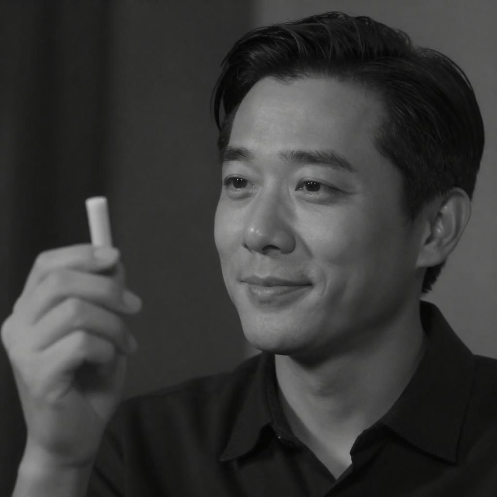 Black-and-white photograph of a man with dark, slicked-back hair, wearing a dark shirt, holding a small, cylindrical object in his right hand. He gazes to the right with a slight smile. The background is dark and blurred, emphasizing his face and the object. His expression is calm and contemplative.