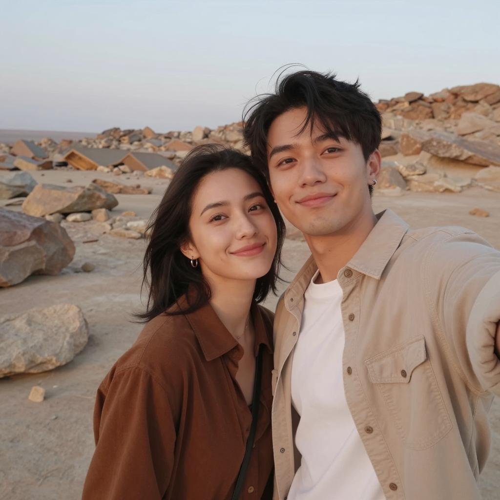 A young couple taking a selfie together outdoors in a rocky desert environment, warm natural soft lighting, casual clothing with earth tones such as brown and beige, relaxed and candid expressions, rugged natural rocky background with muted warm colors, clear sky