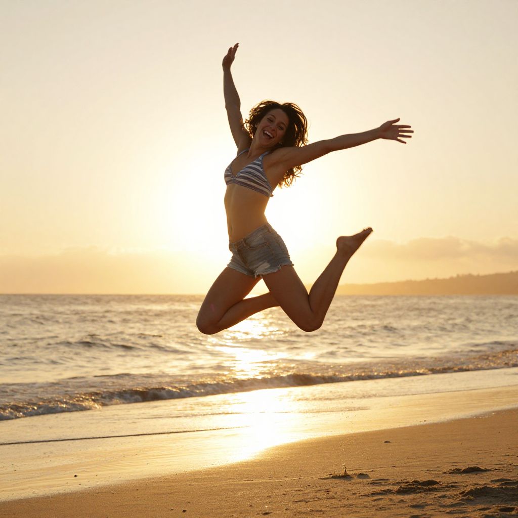Photograph of a young woman with curly hair, jumping joyfully on a beach at sunset, wearing a striped bikini top and denim shorts, with the