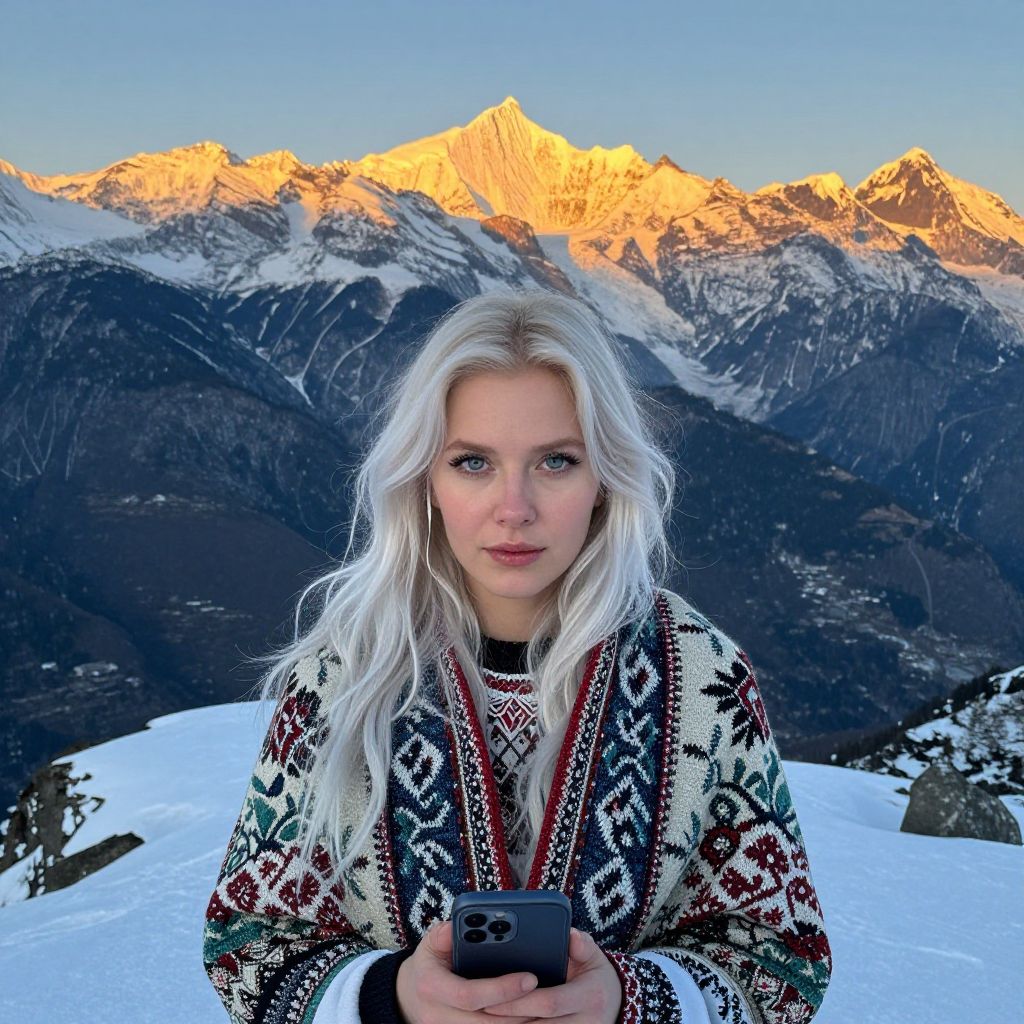 Photograph of a young white woman with long, wavy, platinum blonde hair standing in front of a snow-covered mountain range at sunset. She has light skin, blue eyes, and is wearing a black and white patterned, knit sweater with red lanyard. She holds a black smartphone in front of her chest. The background features towering, sunlit mountains with a clear, blue sky. The snow on the ground is bright white, contrasting with the dark, rocky peaks in the distance. Her expression is neutral, and she gazes directly at the camera.
