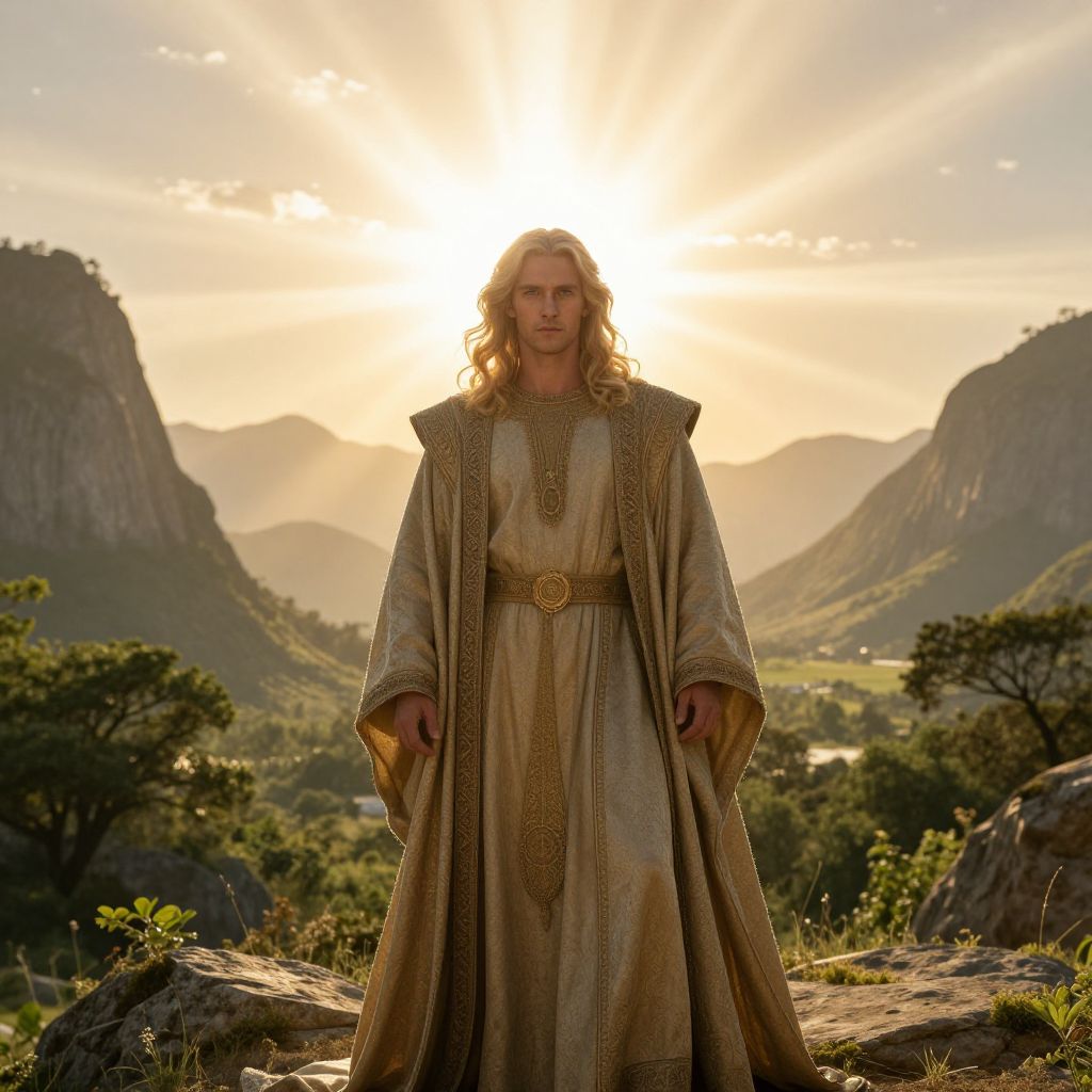 Majestic portrait of a stalwart individual, proudly draped in an American flag circle, bathed in radiant divine light, as he stands firm amidst a sweeping, epic cinematic landscape, replete with towering mountains, rolling clouds, and celestial bodies, set against a grand, biblical backdrop, evoking awe-inspiring reverence. Man has masculine face and piercing eyes