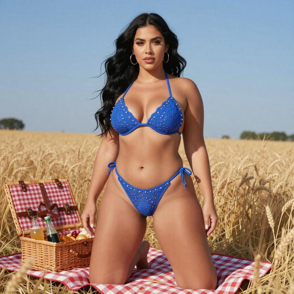 Photograph of a curvy woman with long brown hair, wearing a yellow floral bikini, holding a wicker picnic basket. She stands on a grassy field with white cliffs and a blue ocean in the background. She looks directly at the camera with a confident expression.