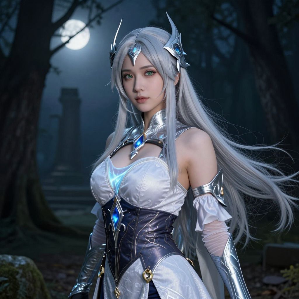 A stunning woman with long, flowing silver hair wearing a detailed silver hair wig, standing in a dark forest at twilight, dressed in an elaborate fantasy costume with glowing blue accents, her face illuminated by moonlight, featuring high cheekbones and deep green eyes, posing confidently against a backdrop of misty trees and ancient stone ruins.. The woman has big breasts and cute face