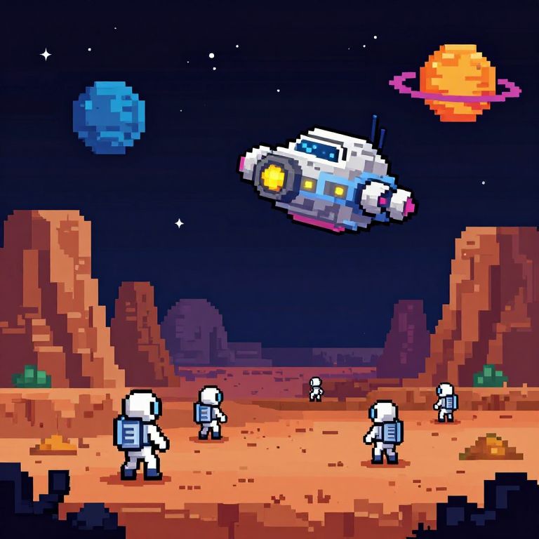 Pixel art of five white-suited astronauts standing on a red desert planet, with a colorful spaceship flying above, blue planet, and orange ringed planet