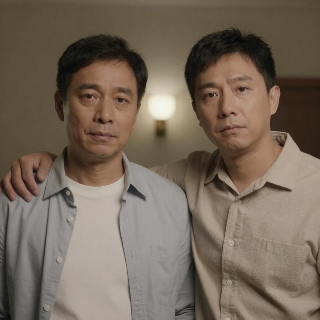 Photograph of two men, close-up. Left man with intense gaze, sharp features, short dark hair, slightly lighter skin tone. Right man with neutral expression, slightly wrinkled skin, dark hair, darker skin tone. Both wear collared shirts, dimly lit background.