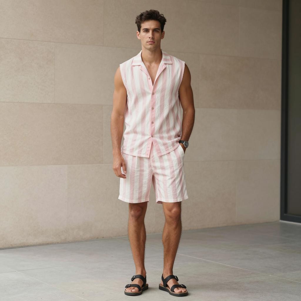 Piece summer costume, photorealistic, male standing, full body, front view, casual summer outfit, pink and white striped sleeveless shirt, matching shorts, slightly open shirt, wristwatch, sandals, short dark hair, light brown skin, beige stone wall background, daylight, concrete floor, modern urban setting, slightly shadowed, relaxed pose