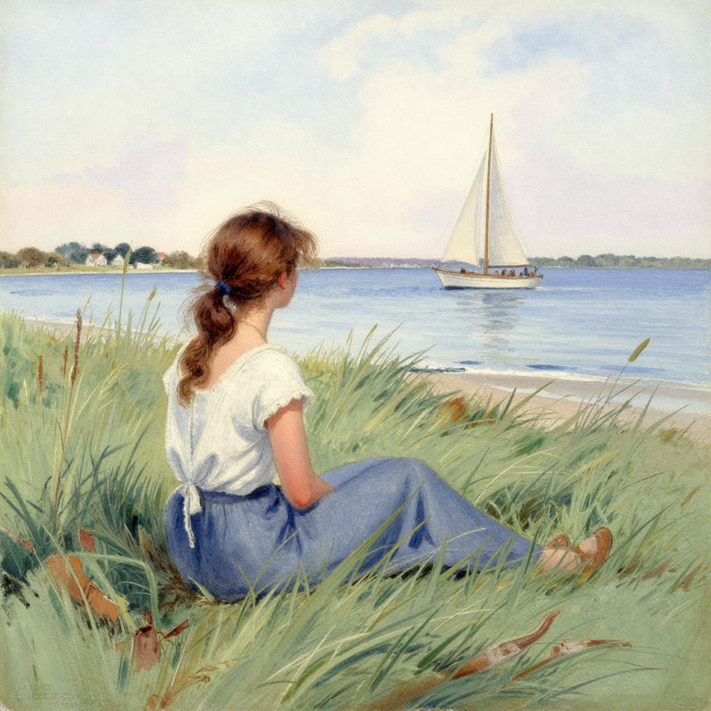 Woman seated gracefully in tall green grass by the seaside, gazing toward a sailboat on calm blue waters under a soft sky, evoking the serene coastal charm of Nantucket as depicted in Dennis Miller Bunker's 1890 watercolor masterpiece, *La Fille Fisher*.