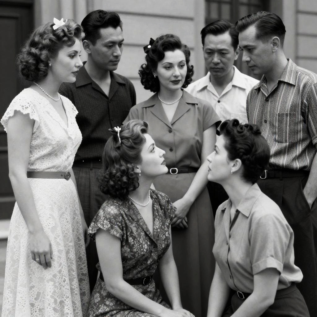 Black-and-white photograph of six people in ornate, vintage 1930s-40s clothing. Women with elaborate hairstyles, lace dresses, and fur accents. One woman kneels in center, looking up at standing woman on left. Men in patterned shirts, serious expressions. Background with architectural details. Group closely clustered, interacting.