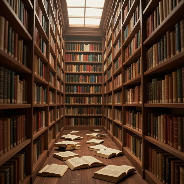 In a hauntingly serene 3D-rendered library, rows of wooden shelves brimming with books stretch into the distance under a dramatic skylight, casting a vintage glow over scattered open volumes that seem to whisper enigmatic truths, inviting viewers into a world of paradoxical wisdom.