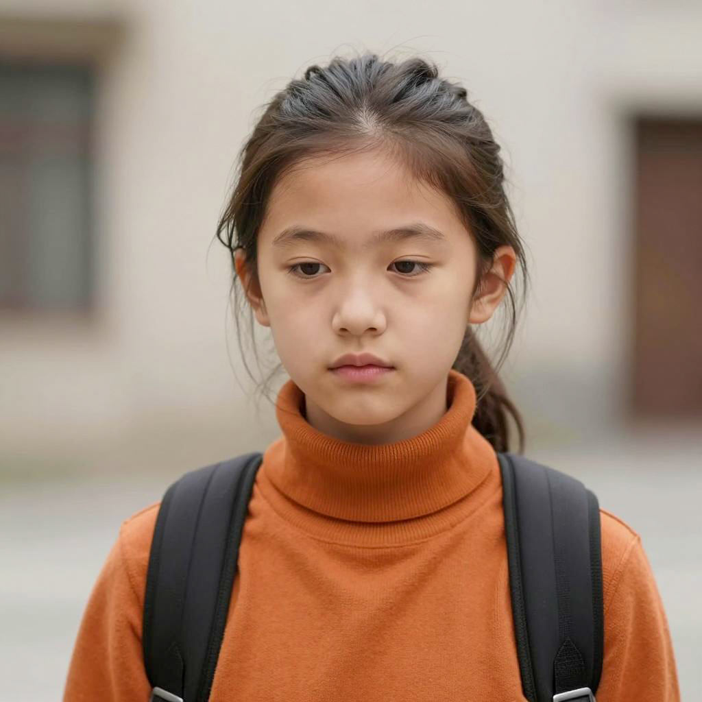 Childrens suit, photorealistic portrait of young Asian girl with long braided hair, standing in a sunny garden, wearing beige blazer and pants, white top, black shoulder bag, hands in pockets, colorful flowers in background, greenery, bright sunlight, clear blue sky, slight depth of field, casual yet elegant, realistic ures, daytime setting
