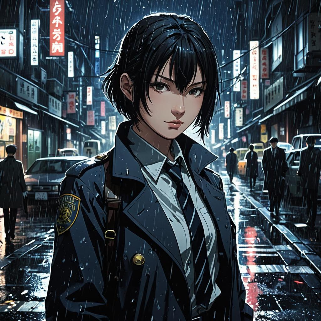 Illustration of a young female detective with short black hair, sharp eyes, and a subtle smirk, wearing a dark trench coat and a striped tie over a white shirt. She stands confidently in a rain-soaked city street at night, with wet reflective pavement and illuminated signs featuring Japanese characters in the background, capturing a gritty and suspenseful anime style.