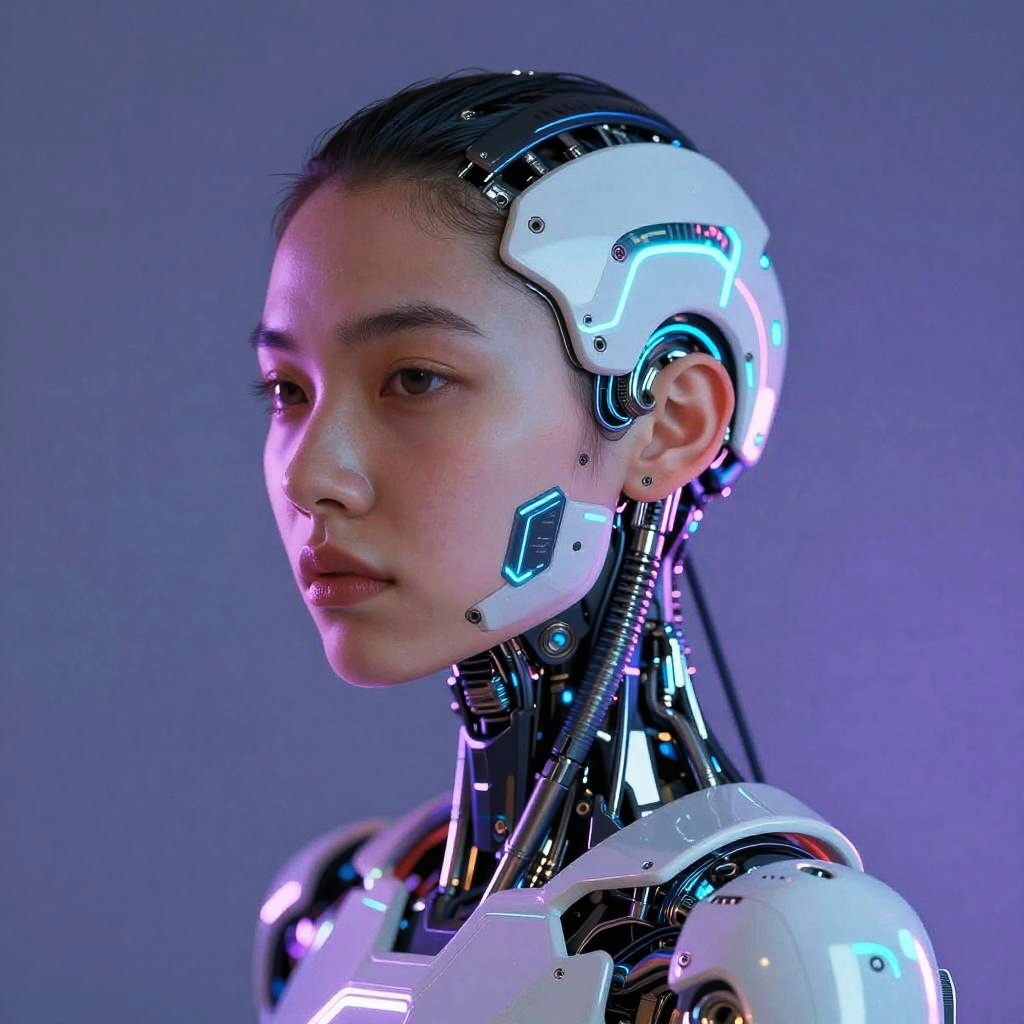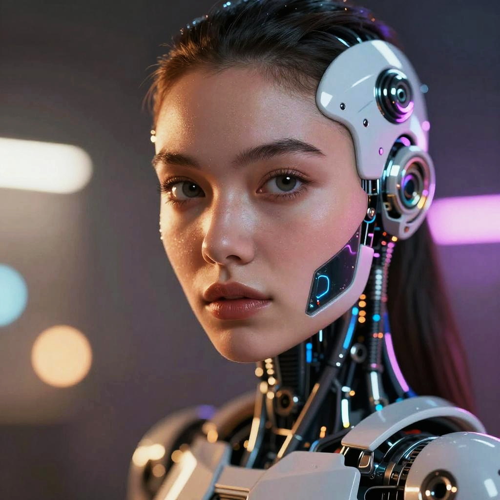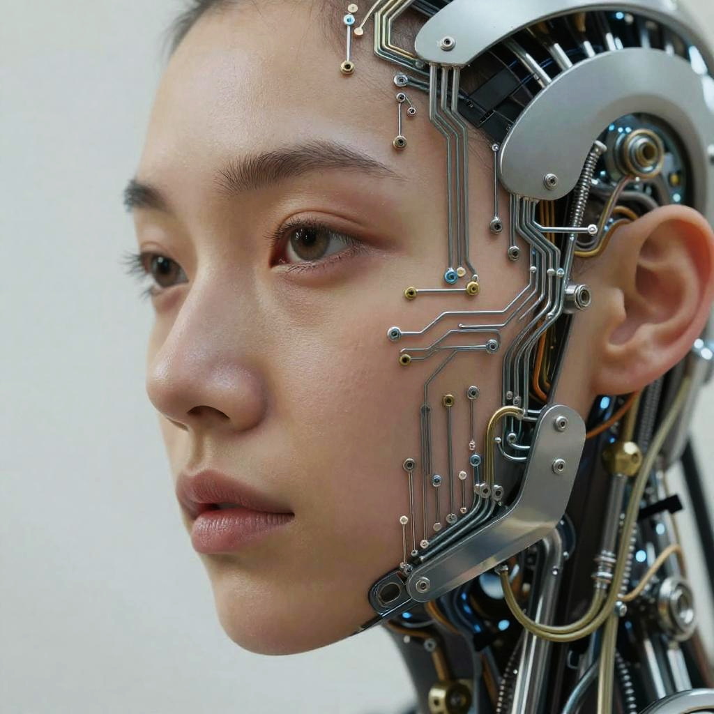 Realistic AI generated art portraying a close-up of a human face merging with mechanical elements, showcasing intricate circuits and soft skin textures, high detail, blending the organic and synthetic seamlessly, photorealistic style, high dynamic range.
