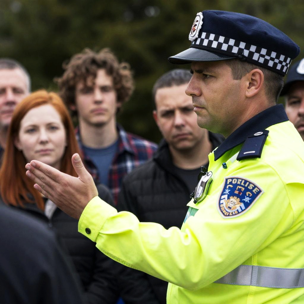 Photo of a police officer wearing a neon yellow jacket and a black and white checkered police hat, gesturing with his right hand while speaking to a group of people outdoors. The crowd includes a woman with red hair, a young man with curly hair in a plaid shirt, and several others. The background features dense green foliage. The officer has an intense, focused expression.